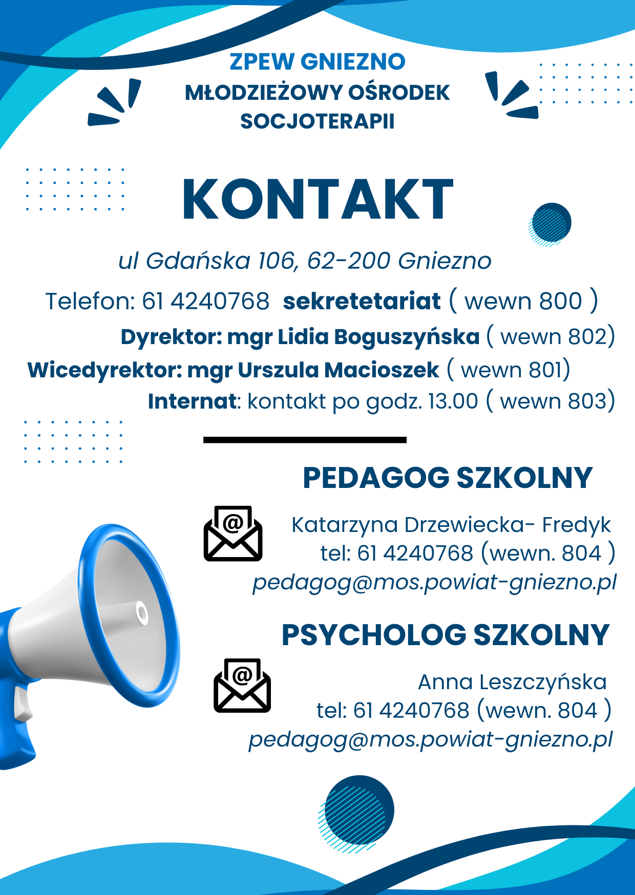 W roku szkolnym 2024/25 p pedagog Katarzyna Drzewiecka-Fredyk jest do Państwa dyspozycji od poniedziałku do piątku w godzinach 8-14