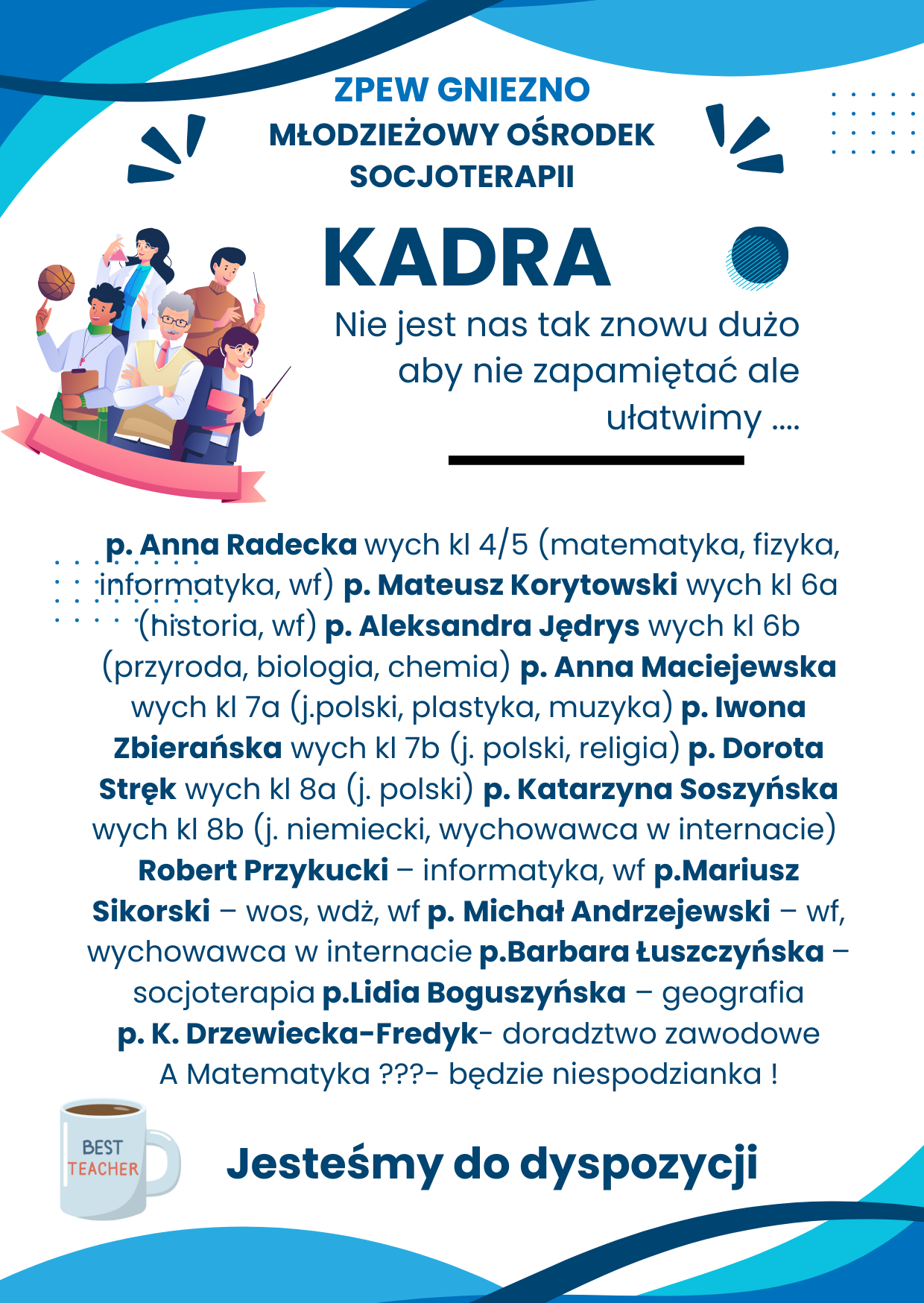 Publikujemy zestawienie godzin dostępności nauczycieli i wychowawców którzy są do Państwa dyspozycji w razie pytań i potrzeby kontaktu